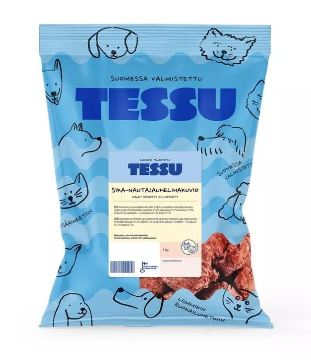 Raakapakaste uudelleensuljettavassa pussissa. Näppärän kokoinen sika-nautajauhelihakuvio (n. 30 g/ yksittäinen kuvio) sisältää kotimaista sian ja naudan lihaa sekä naudan keuhkoa.